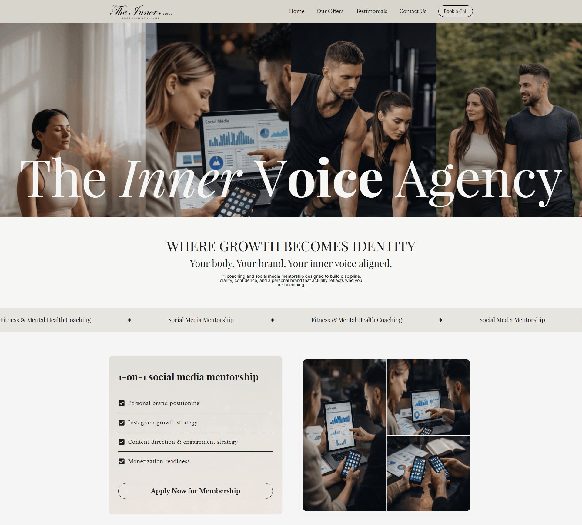 A premium website for Agency where growth becomes identity. Social media mentorship designed to build discipline, clarity, confidence, and a personal brand that actually reflects who you are becoming.